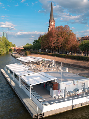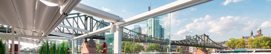 Celui qui boit ici sa petite bière après le travail a à ses pieds la magnifique ligne d'horizon du quartier des banques de Francfort : le bateau-restaurant et événementiel Freigut est situé au centre de la métropole hessoise sur le Main, juste à côté de l'Eisernen Steg, un pont piétonnier riche en traditions. Par beau temps et drapeau hissé, l'entreprise de restauration est ouverte et les clients peuvent profiter de la vue fantastique - depuis peu, ils sont également parfaitement protégés du vent et des intempéries. L'exploitant Thomas Klüber a en effet équipé son lieu flottant de stores en pergola résistants aux intempéries.