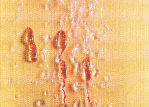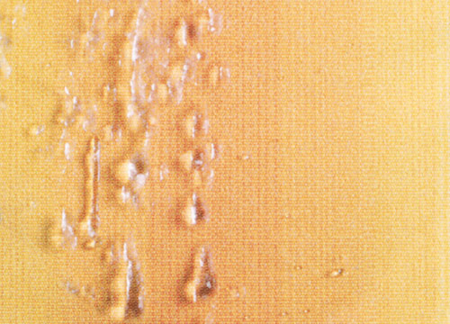 Cela signifie que la substance collante ne peut pas s'infiltrer dans le tissu. Si l'on met de l'eau à présent, le miel et l'eau s'écoulent sur la surface de la toile à scellement nano.